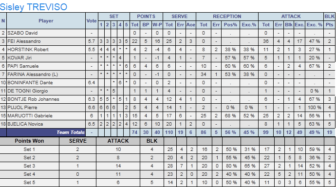 Sisley Treviso: Maruotti xxx, Bjelica xxx, Fei xxxx, Horstink x, Bontje xxx, Puyol xxx, Farina (L) xx, Papi xxx, Kovar xx, De Togni x, Boninfante x